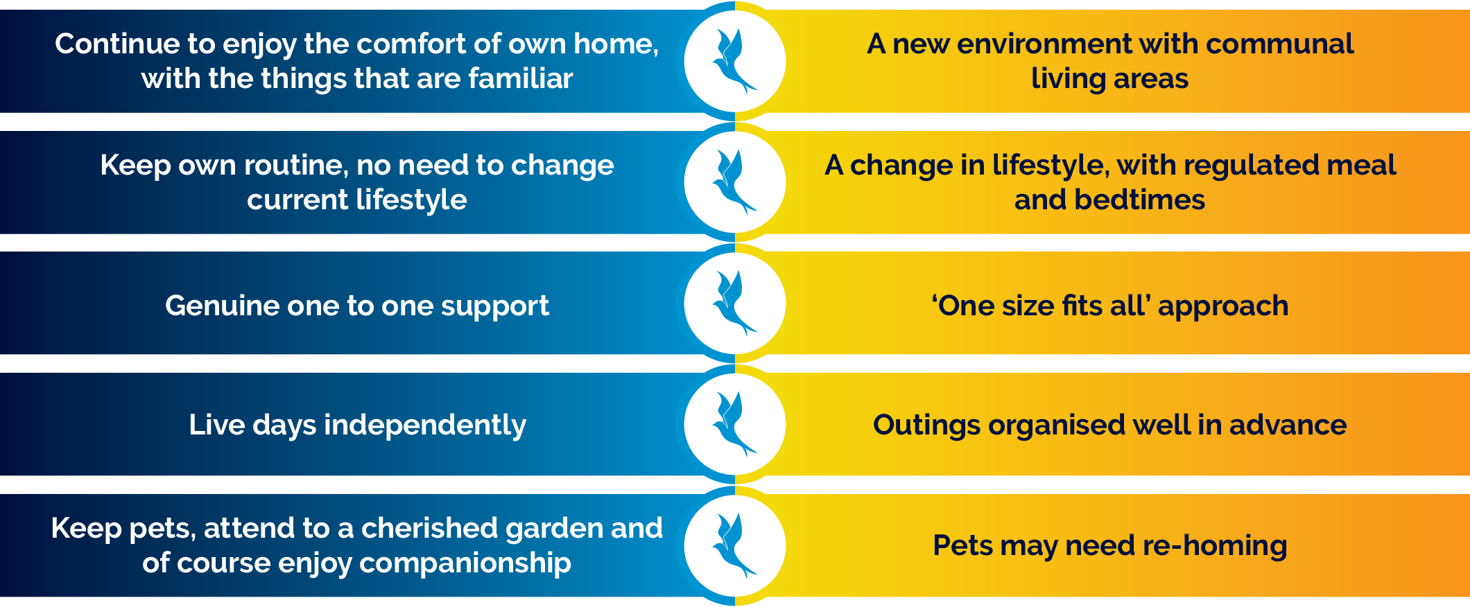 Many people considering Live-in Care will also be looking at care homes and the difference between the two. Live-in Care is a real alternative and can have many physical and emotional benefits, especially when compared to life in a care home.