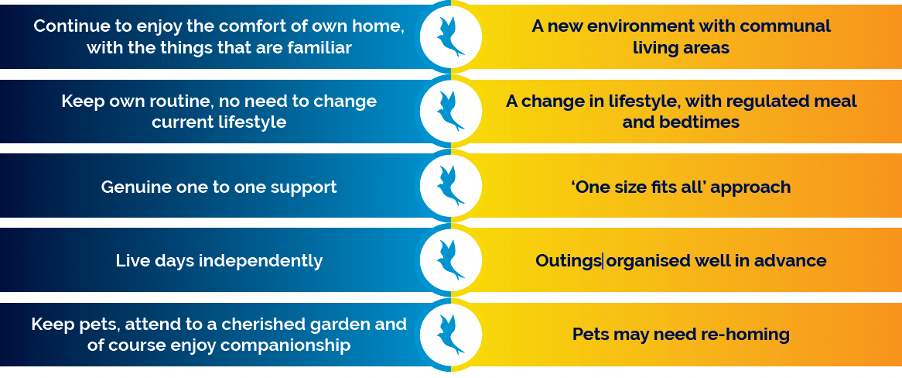 Many people considering Live-in Care will also be looking at care homes and the difference between the two. Live-in Care is a real alternative and can have many physical and emotional benefits, especially when compared to life in a care home.