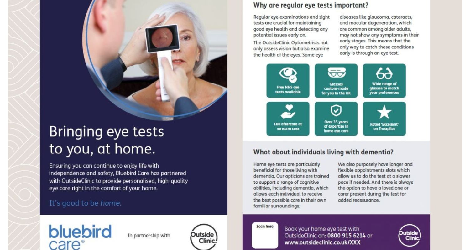 designed to ensure that individuals who find it difficult to access traditional optician services can receive high-quality eye care in their own homes. OutsideClinic is happy to deliver their eye tests for free for all Bluebird Care customers who cannot easily visit their local high street optometrist, even if our customer is not eligible for the free NHS service.